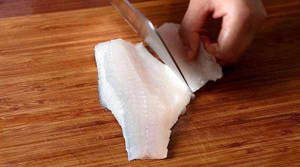 3、 鱸魚首先要先給它處理幹凈,頭尾分離,魚身用刀沿著魚骨把兩邊的魚肉片下來,把中間的脊骨切成段,把魚肉上的排刺去除後切成片狀。
