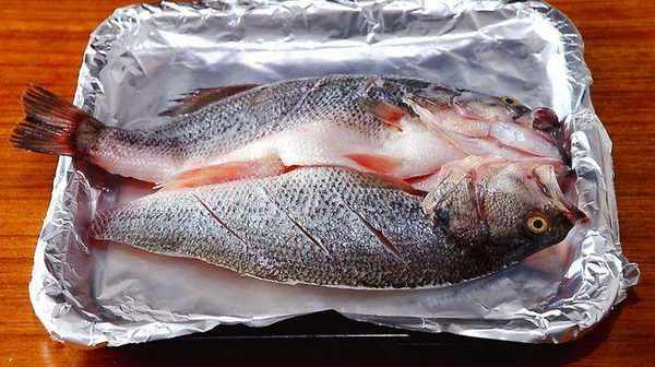 3、 烤盤中鋪上一層錫紙或者油紙,把處理好的鱸魚放在上面烤盤上,然後進烤箱230度烤40分鐘。