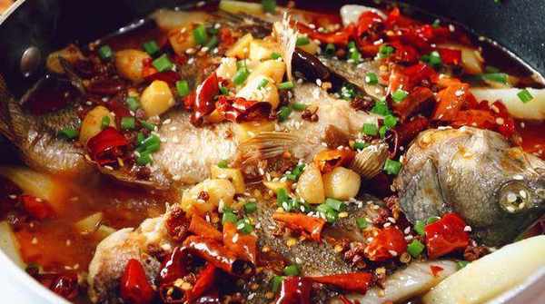 7、 另取一口鍋,往鍋中倒入洋蔥、黃瓜和土豆,把烤過的鱸魚鋪在蔬菜上,接著把煮好的湯汁倒入魚上面,加熱後在最上面撒上一些紅椒和花椒。