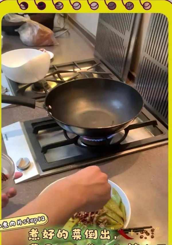 12:將煮好的牛肉撈出,和煮好的配菜一起放在碗中,加入花椒和辣椒面。視頻中李易峰感慨小時候吃爸爸做的水煮肉片,而現在父親的腰也佝僂瞭,手也粗糙瞭,臉上佈滿瞭風霜。可見李易峰和他的父親感情很好。