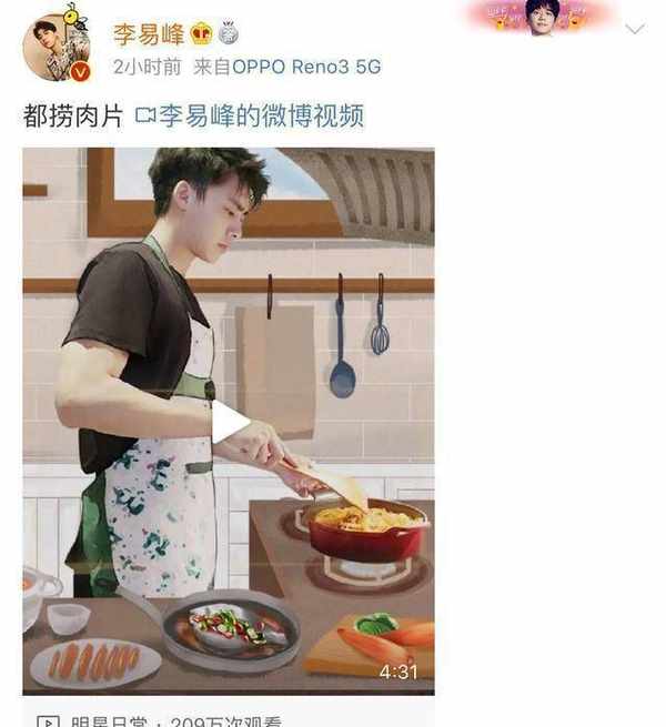 令人想不到的是如此帥氣陽光的的李易峰居然還能做飯。4月25日,李易峰通過社交平臺曬出一則短視頻,並配文"都撈肉片”。在視頻中看著帥氣陽光的李易峰圍著花色的圍裙,一本正經的講解著水煮肉片,最終做出的水煮肉片的賣相不錯,網友隔著屏幕直呼想吃。