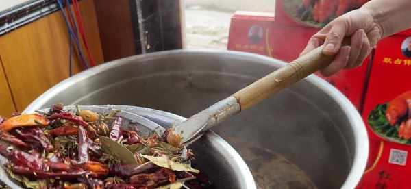 鍋開小火下入香料:香果5克,八角10克,香茅草10克,桂皮10克,山奈5克,丁香3克,小茴香5克,陳皮6克,白芷5克,香葉5克,慢慢炒出香味後加入白酒,炒三到五分鐘,激發香料的香味,不要用大火,香料炒糊瞭容易發苦,炒好後裝入紗佈袋備用。