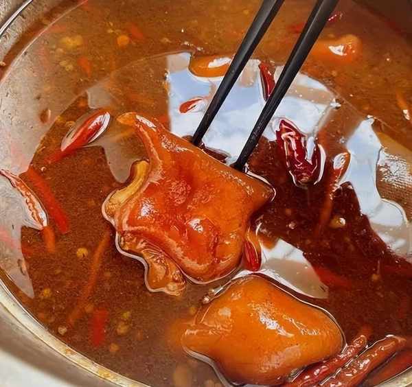 老板娘祖孫三代都是賣豬蹄的,從她爺爺輩就開始賣豬蹄,一直傳到她這裡,她傢的豬蹄分為兩種口味,一個是五香味的一個是麻辣味道的。一鍋高湯反復使用,加入二三十種浸泡過的香料,過油的豬蹄下入高湯,加入水和鹽調味,純天然不添加其他的科技作料,鹵一個小時燜一小時,軟爛脫骨,吸引瞭無數的回頭客。看似簡單操作的鹵豬蹄,能傳承三代人,並且口味依舊,主要還是在於熬好一鍋高湯和香料的選擇上。