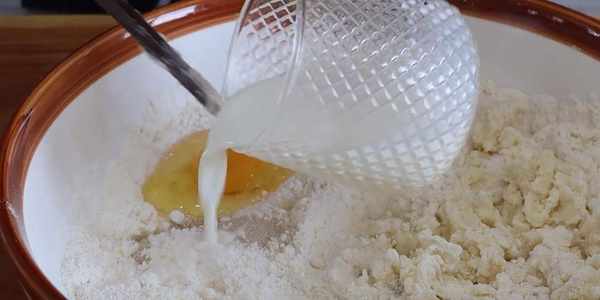 2.另一邊磕入一個雞蛋,加入5克酵母,4克鹽。喜歡甜口的就把鹽換成20克白糖。再用130毫升純牛奶攪拌成面絮狀。