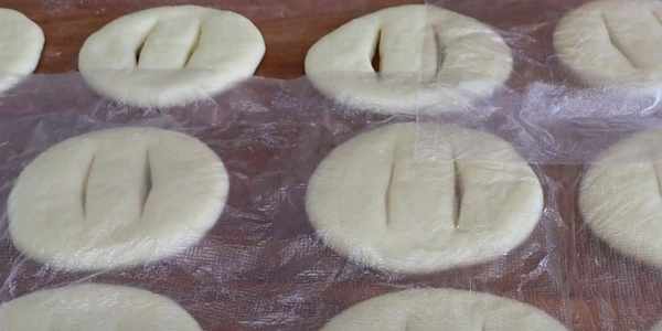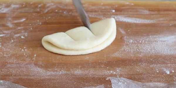 8.把面片對折過來,用刀切成兩下。邊緣不要切斷瞭。再把它展開,一個生坯就做好瞭。