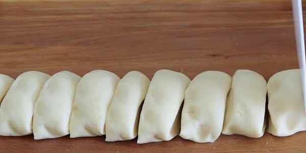6.把它移到案板上,給它揉搓排氣,再搓成長條。然後切分成大小均等的面劑子。想吃大一點的就分大塊。