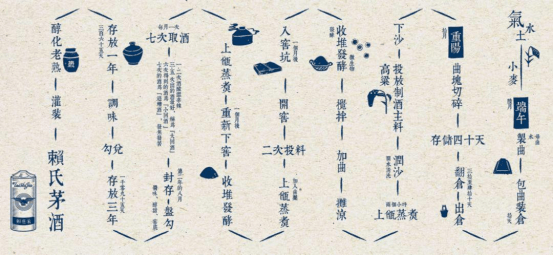 以貴州當地優質紅纓子糯高粱和赤水河水為原料,經過大曲坤沙工藝和精研的回沙技術釀造,過程持續瞭1年才完成,還要窖藏8年,加以10年的基酒勾調而成,由於是陳年老酒,酒體顏色微微黃,酒香中的層次非常豐富,不是勾兌酒能做到的。