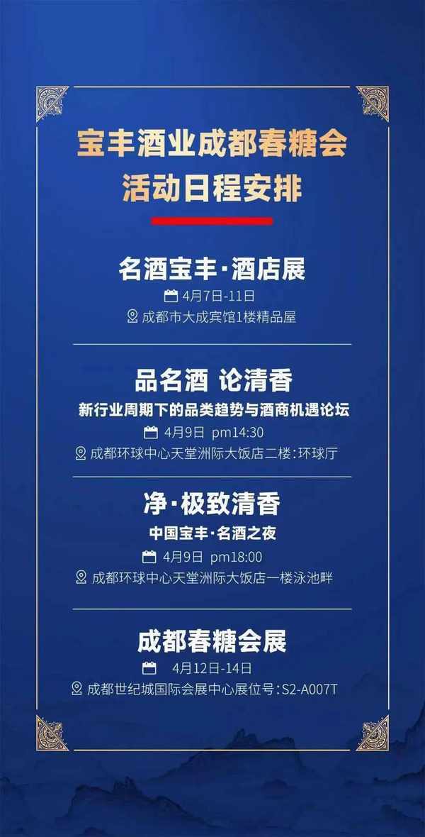 春糖期間,寶豐酒業將再次進行一城雙展,4月7日-11日的酒店展,位於成都市大成賓館一樓;4月12日-14日的會展展,在成都世紀城國際會展中心S2-A007T。