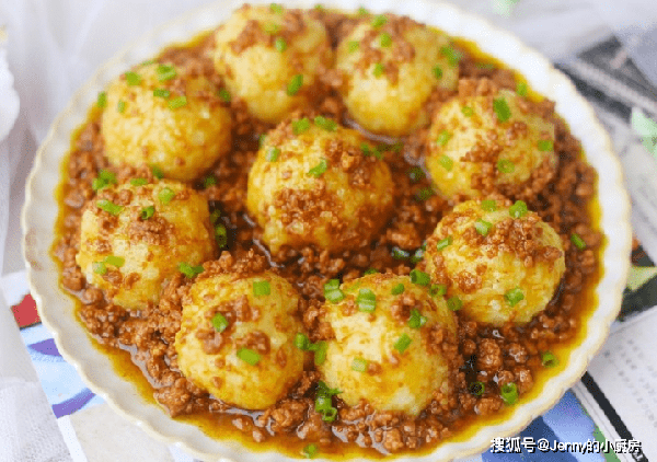 最後將肉末澆在土豆球上,撒些蔥花點綴,這道菜就做好瞭。