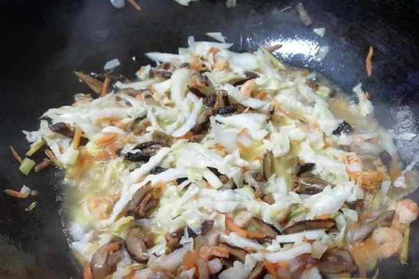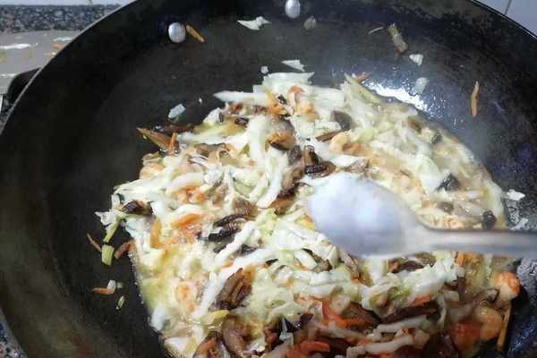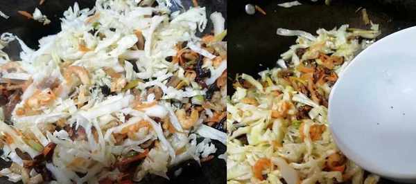 放入白菜絲翻炒均勻後,倒入浸泡蝦米的水,水不夠,再添點清水;