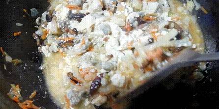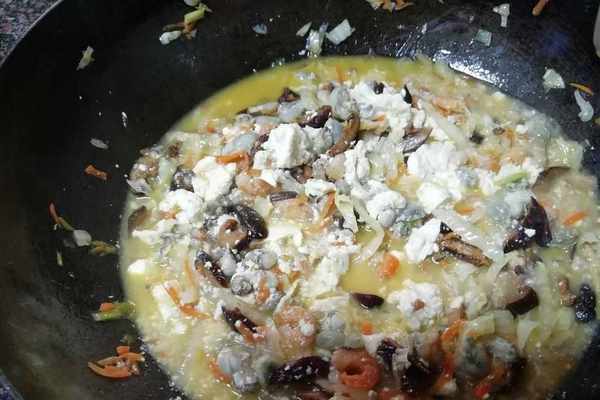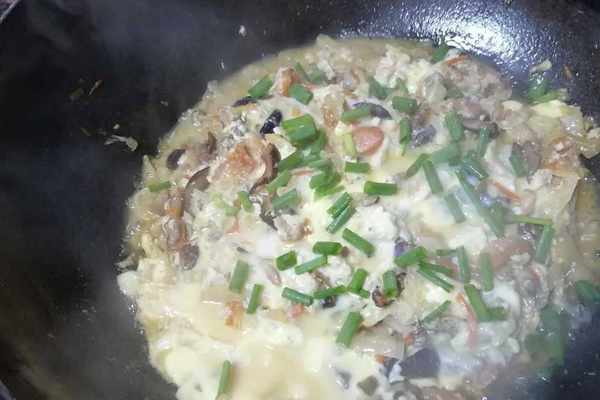 往中間倒入蛋液,讓豆腐香菇海蠣等凝結在一塊;