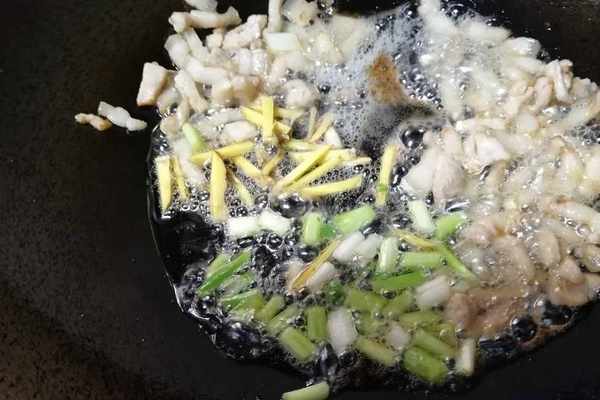 起鍋燒油,煸炒五花肉,煸出油脂;