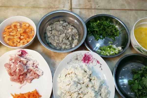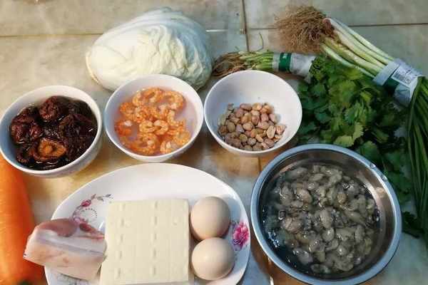 老豆腐1塊、五花肉、海蠣、香菇、蝦米、白菜、胡蘿卜、香蔥、芫荽、生薑、雞蛋和花生米等;