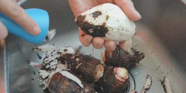 第二步:準備5個香芋頭,這種農家種的香芋頭比較小,如果是大芋頭一個就差不多了,把芋頭的皮削掉,怕癢的朋友要戴上手套哦,削好把它沖洗一下,再把它切滾刀塊,切好放一邊備用。