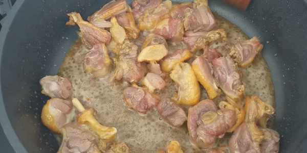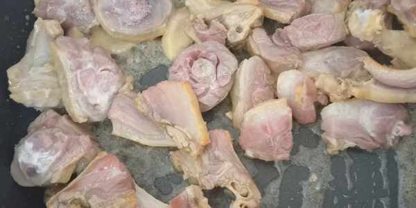 第四步:食材準備好,起鍋燒熱,放入薑片爆香,再倒入鴨塊翻炒,把鴨油炒出來,開始出油時,淋入一點料酒,然後繼續翻炒。