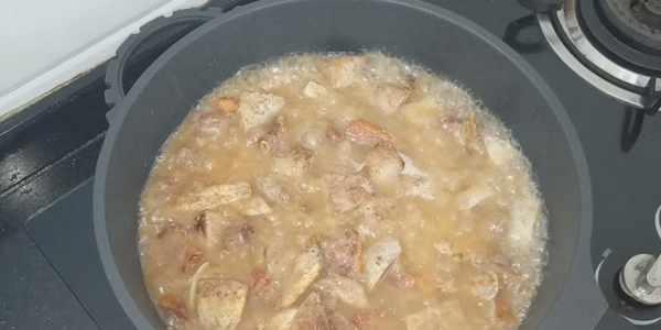 第八步:翻炒均勻後加入開水,水量稍微沒過食材就可以了,加上兩勺白糖,攪拌均勻後蓋上鍋蓋,調中火燜25分鐘,如果鍋容易燒幹,要多加一點開水。