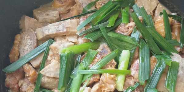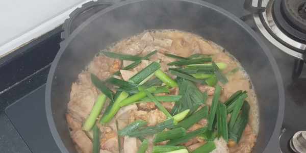 第九步:香芋和臘鴨腿肉燜得差不多了,我們把蒜苗加進去,再淋入一點花生油,蓋上鍋蓋,繼續燜多兩分鐘,因為香芋比較吸水,所以大家要關注一下鍋中的汁剩餘多少,要是這一步幹了的話,就要再加少許開水進去,一定要把蒜苗煮熟哦。