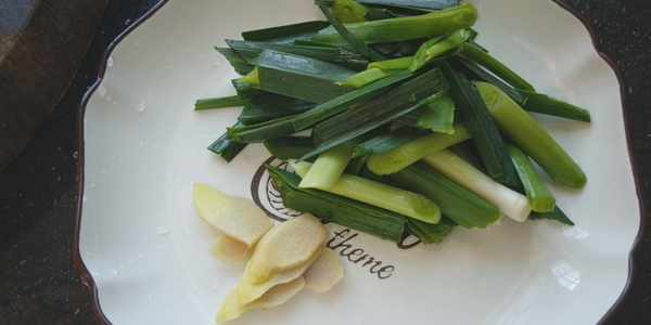 第三步:準備兩棵蒜苗洗淨,把蒜頭和蒜梗拍一下,然後切成段備用,準備一小塊薑去皮洗淨後切片備用。