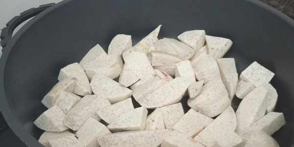 第六步:重新把鍋洗淨,然後下少許油燒熱,再把香芋塊倒進去煎一下,邊煎邊翻動一下,把它煎至金黃,建議調中小火來煎,火太大很容易糊掉。