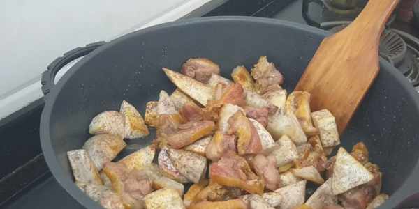 第五步:把臘鴨腿肉的油炒出後,關火,把鴨腿肉夾出備用,炒出的油倒掉不要。