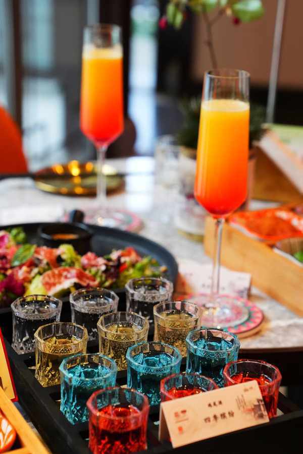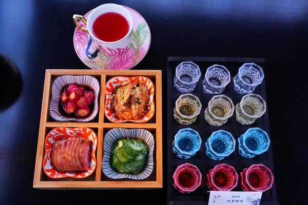 冷菜九宮格:剌身拼盤、月式燒島、炭烤青花魚、京蔥雞腿肉、五花肉聖女果、梅醬雞胸肉、脆皮雞翅、酥香魚翅千、照燒鳳尾。