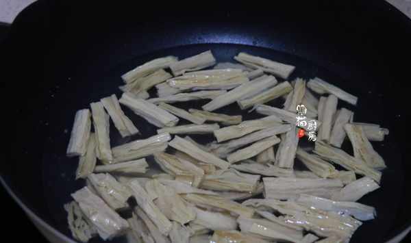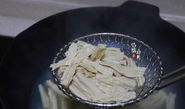 2.泡發軟的腐竹放入熱水鍋中,去去豆腥味。?