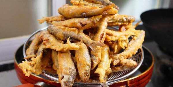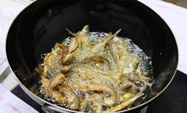 鍋裡多來點油,油溫六成熱,把小串條魚下鍋,炸至金黃酥脆後,就可以撈出來吃啦,一口一個,酥脆好吃,非常美味,可別不知道吃哦。