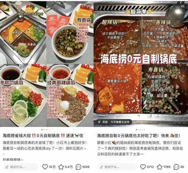 事實上在小紅書等平臺,隨手一搜,就能找到各種“窮吃海底撈”的攻略。像0元自制鍋底、100元吃垮海底撈這類帖子,可以說是隨處可見。