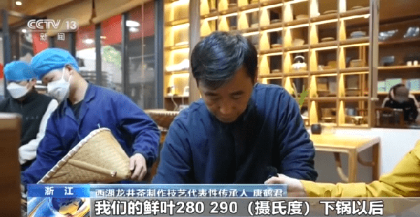西湖龍井茶制作技藝代表性傳承人 唐鶴君:我們的鮮葉280-290攝氏度的鍋溫下鍋,炒個七八分鐘以後,就變成這樣瞭,挺秀尖削的樣子就出來瞭,兩頭尖尖中間鼓出。