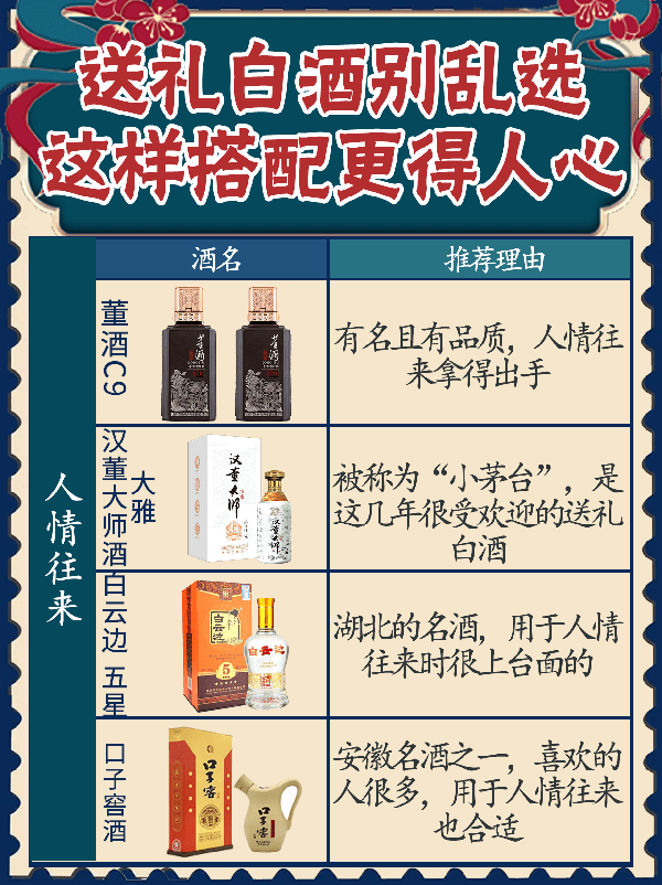 人情往來 董酒C9——有名且有品質,人情往來拿得出手 漢董大師酒 大雅——被稱為“小茅臺”,是這幾年很受歡迎的送禮白酒 白雲邊 五星——湖北的名酒,用於人情往來時很上臺面的 口子窖酒—— 安徽名酒之一,喜歡的人很多,用於人情往來也合適