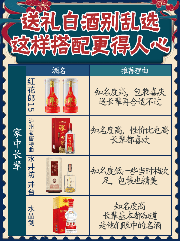傢中長輩 紅花郎15 ——知名度高,包裝喜慶,送長輩再合適不過 瀘州老窖特曲 ——知名度高,性價比也高,長輩都喜歡 水井坊 井臺——知名度低一些當時檔次足,包裝也精美 水晶劍——知名度高,長輩基本都知道,是他們眼中的名酒