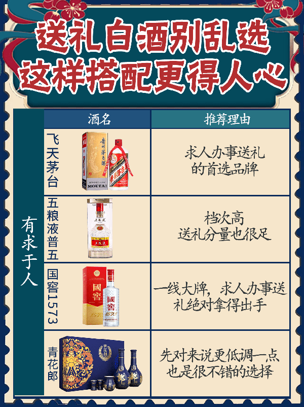1,有求於人 飛天茅臺——求人辦事送禮的首選品牌 五糧液普五——檔次高,送禮分量也很足 國窖1573 ——一線大牌,求人辦事送禮絕對拿得出手 青花郎——先對來說更低調一點,也是很不錯的選擇