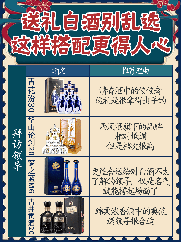 2,拜訪領導 青花汾30 ——清香酒中的佼佼者,送禮是很拿得出手的 華山論劍20——西鳳酒旗下的品牌,相對低調,但是檔次很高 夢之藍M6——更適合送給對白酒不太瞭解的領導,僅是名氣就能撐起場面瞭 古井貢酒20——綿柔濃香酒中的典范,送領導很合適