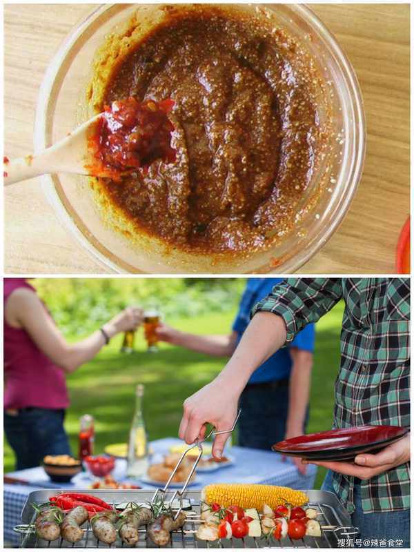 4、自制醬料。醬料不需要太復雜,傢裡普通的調味料就能調出味道絕美的燒烤醬。蠔油、甜面醬、蒜蓉辣醬,按照1:1:2的比例調勻,再加入一小勺孜然粉、五香粉調勻即可。素菜在烤盤上烤的時候,刷點醬料,再刷點食用油,味道非常棒!