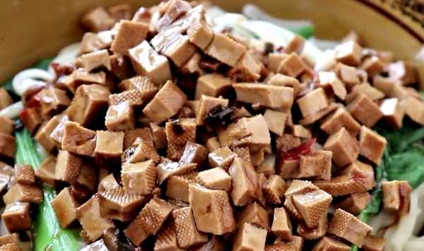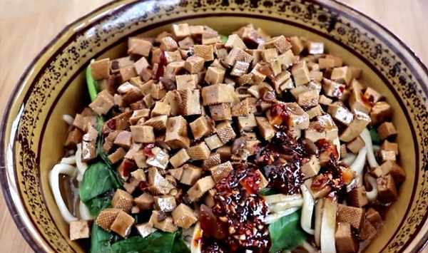 接下來,把麵團取出來,先揉搓一會,再擀成薄面皮,擀得越薄越好,擀的過程中,麵團容易粘連,要記得多撒點幹麵粉,擀好後,將它折疊起來,切成麵條抖散開。在鍋裏燒開水,把麵條放進去煮,煮熟後,加上一把青菜燙一下,把青菜燙軟出鍋,加上調好的豆干鹵汁、辣椒油攪拌均勻,這樣就可以開吃了。