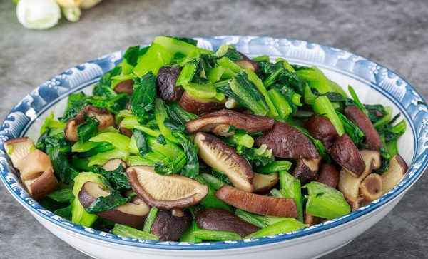 香菇去蒂,洗凈後切成片,小青菜洗凈之後,控幹水分,大蒜切末。鍋內添上適量的油,加上蒜蓉爆香後,倒入青菜、香菇,一起翻炒。炒到變軟,用鹽、雞精、蠔油來調味,炒勻倒入少許水淀粉,勾芡至濃鬱後,出鍋。