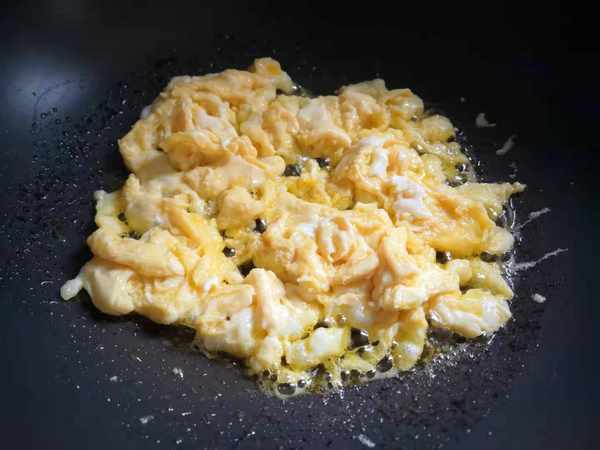 5、鍋裡放油,燒至七八成熱,倒入打散的雞蛋,煎至定型後用鍋鏟鏟成小塊,盛出備用。