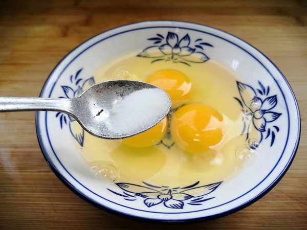 3、碗中打入三個雞蛋,加入適量食鹽,用筷子攪拌均勻成雞蛋液。