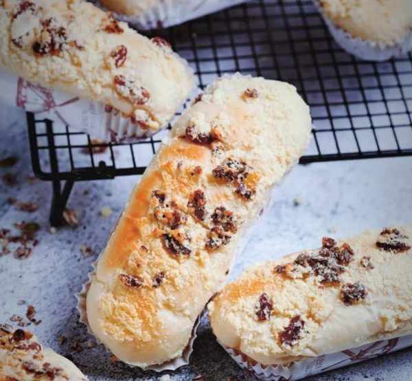 2。然後,面包機完成後,面團被分成8部分,手指戳時面團沒有反彈或收縮。面團變圓後,它會醒15分鐘。面團放完後,會被搟成一個長方形。底部將變薄並卷起放入面包油紙中。然後將其放入兩倍大小的烤箱中40分鐘。牛奶、黃油、煉乳和葡萄幹將放在一個容器裡。微波爐稍加熱後,攪拌均勻;