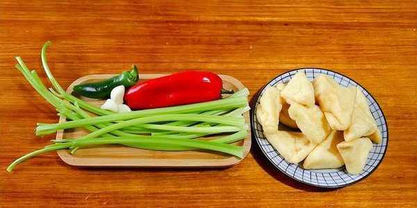 2、大蒜去皮切成片狀,青紅椒去蒂去籽切成小丁,油豆腐切成兩半。