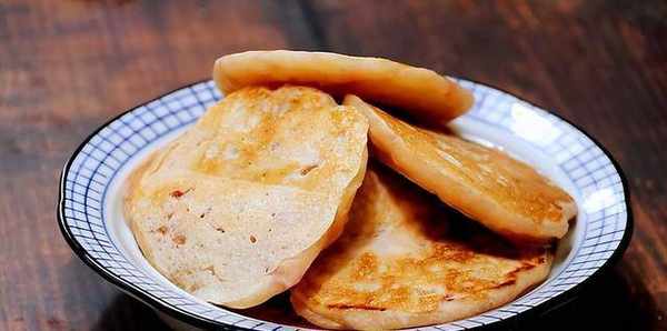 5、鍋加熱,借助勺子把面糊倒入鍋中,煎成餅狀,等定型後記得翻面煎至另一面。