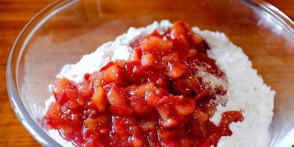 3、等到山楂被煮軟煮化後盛出,放入大碗中,往裡面加入250g面粉、180g清水,用筷子充分拌勻。
