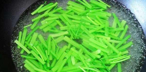 3、鍋中加水燒開,把芹菜倒進鍋中焯一下水,撈出控水。