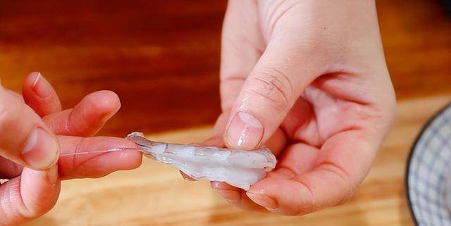 2、大蝦剝掉蝦殼兒,把後背的蝦線也抽掉,清洗一下給它剁成蝦泥,加入一勺鹽、兩勺生抽、少許雞汁、少許白胡椒粉,用筷子攪拌上勁裝入裱花袋中。
