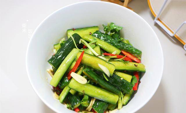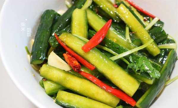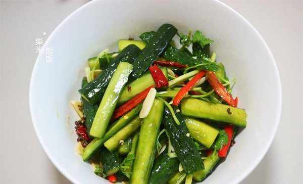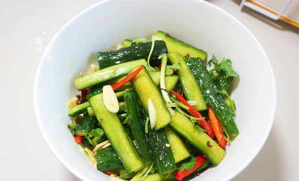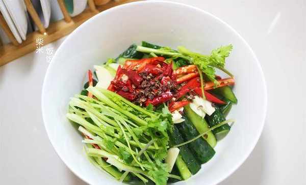 【食材】黃瓜、香菜、紅尖椒、幹辣椒、大蒜、花椒、鹽、白糖、生抽、香醋