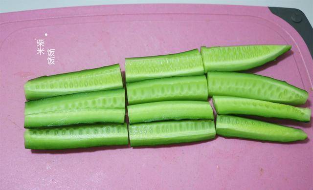 1,黃瓜洗凈,豎著對半切開,每一半再對半切開。一根黃瓜切成4個長條,再把瓜瓤去掉,然後切成3段。