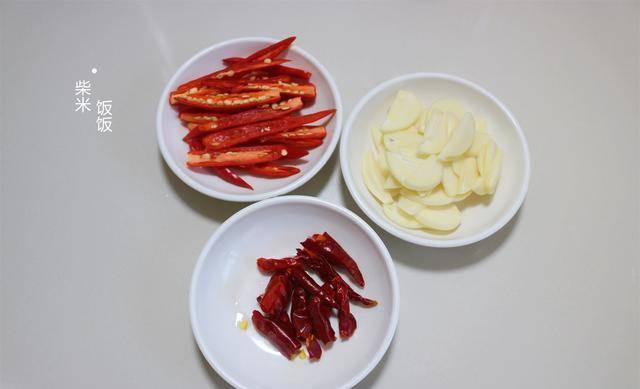 3,準備一些大蒜,切片。小米紅辣椒,對半切開。幹辣椒切段。