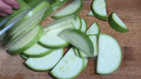 2、 西葫蘆洗凈,切去兩端,然後從中間切開,切成薄片
