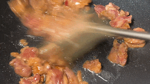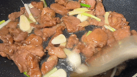 11. 將肉片炒至變色,倒入蔥薑蒜爆香