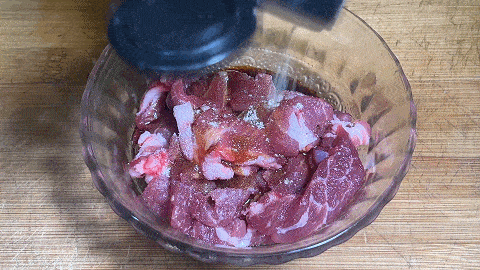 1、 雪花肉切成薄片,加入食鹽,生抽,淀粉,胡椒粉,料酒和食用油醃制